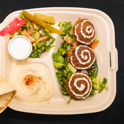 Golden fried falafel served with hummus, salad, pita, and choice...